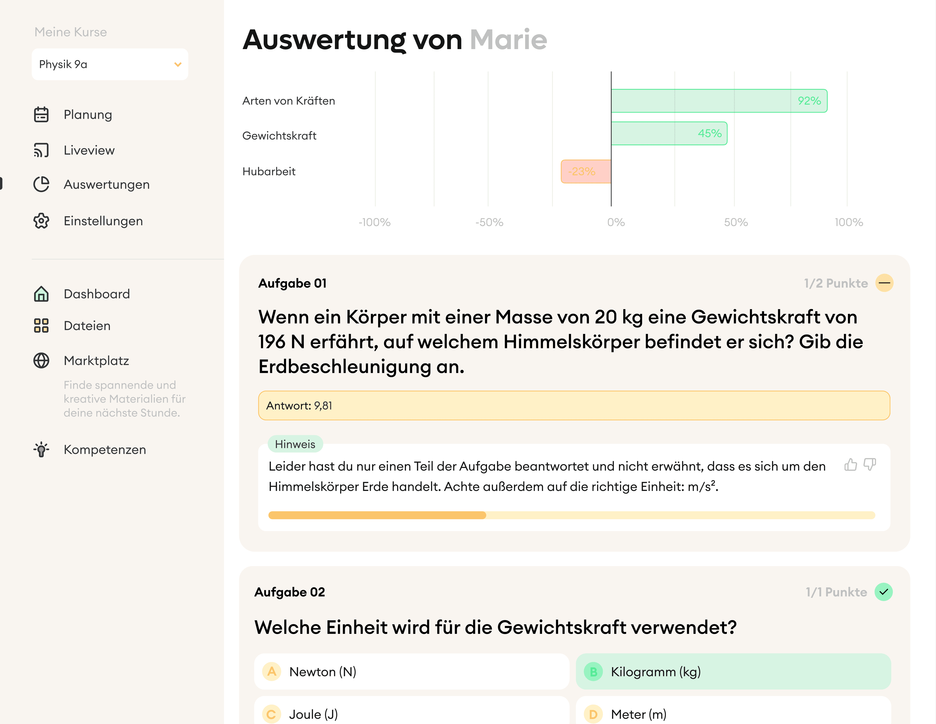 Auf einem Blick erkennst du die Stärken, Schwächen und Kompetenzen deines Kurses. Schoolkit hilft dir, die nächsten Schritte zu machen.